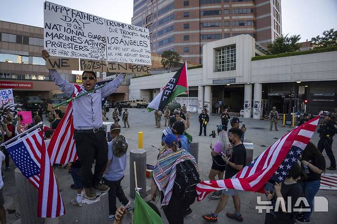 [로스앤젤레스=AP/뉴시스] 15일(현지 시간) 미 캘리포니아주 로스앤젤레스에서 '노 킹스'(No Kings) 시위대가 미 해병대원들이 경비하고 있는 연방 정부 청사 밖을 행진하고 있다. 2025.06.16.