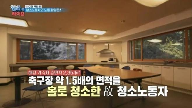 청소노동자 8명이 회의실에서 종이에 무언가를 적고 있었으며 회의실 벽에 걸린 PPT 화면에는 '제1회 미화 업무 필기 고사'라는 문구가 적혀 있었다.