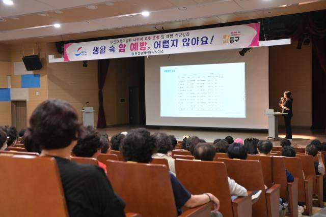 부산 동구(구청장 김진홍) 보건소는 지난 12일 동구 국민체육문예센터에서 주민 200여 명을 대상으로 부산대병원 나민아 교수의 ‘국가암 조기검진과 암 예방’ 건강강좌를 진행했다.