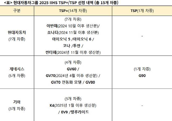 IIHS는 충돌 평가에서 최고 수준의 안전성을 갖춘 차량에 TSP+ 등급을, 양호한 성적을 거둔 차량에 TSP 등급을 부여한다. 이번 현대차그룹 15개 차종 선정은 올해부터 한층 강화된 뒷좌석 승객 안전 평가 기준을 충족했다는 점에서 의미를 더한다.