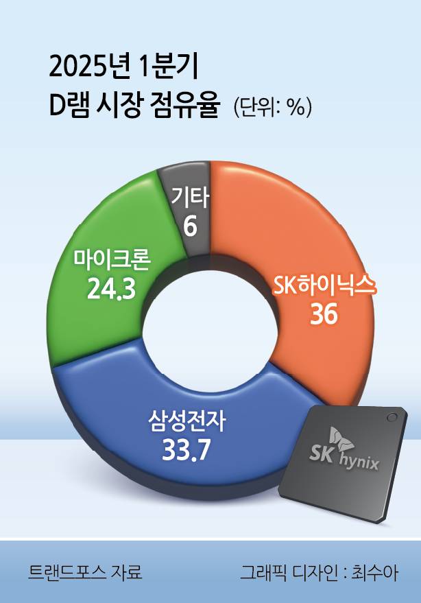 SK하이닉스가 HBM에서 높은 수익성을 기록한 것이 승패를 갈랐다. 카운터포인트리서치의 ‘2025년 1분기 메모리 보고서’에 따르면, SK하이닉스의 전체 D램 출하량 중 HBM의 비중은 14%에 불과했으나, D램 매출과 영업이익에서 HBM이 차지한 비중은 각각 44%, 54%인 것으로 집계됐다.