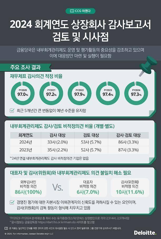 한국 딜로이트 그룹이 16일 발표한 '기업지배기구 인사이트' 제10호에 따르면, 2024 회계연도 상장사 중 내부회계관리제도에 대해 외부감사인으로부터 '비적정' 의견을 받은 86개사 중 88.4%가 감사위원회로부터는 '적정' 의견을 받아 내부평가와 외부감사 간 의견 불일치가 확인됐다.