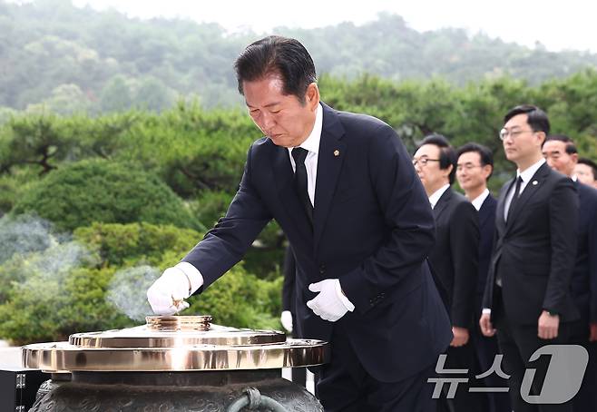 (서울=뉴스1) 김민지 기자 = 더불어민주당 당대표 출마를 선언한 정청래 의원이 16일 오전 서울 동작구 국립서울현충원 현충탑에서 분향하고 있다. 2025.6.16/뉴스1