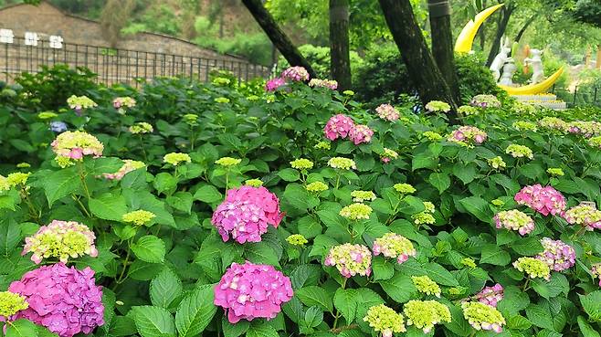 정원을 즐겁게 거닐자, 수국들이 저만치에서 고개를 내밉니다. 여름에 피는 꽃, 수국 덕분에 여름의 열정 속에 들어온 듯합니다. 6월 15일 현재 30% 정도 수국이 꽃을 피워 우리를 반기는 듯합니다.