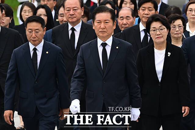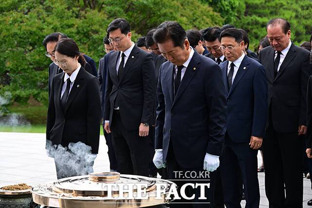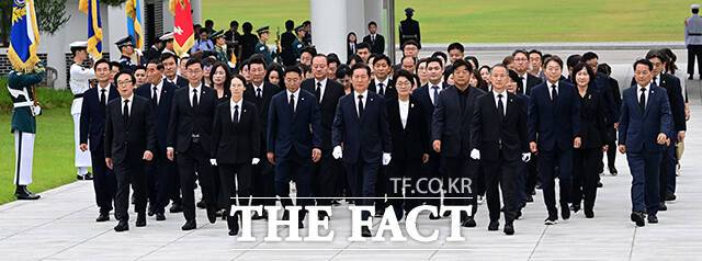 [더팩트ㅣ남윤호 기자] 김병기 더불어민주당 대표 직무대행 겸 원내대표와 당대표 선거에 출사표를 던진 정청래 의원이 16일 오전 서울 동작구 국립서울현충원에서 만나 인사를 하고 있다.