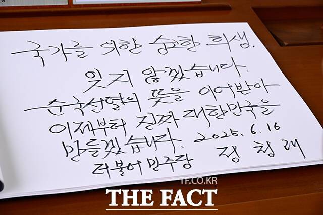 장경태, 최기상, 양문석 의원 등과 함께 현충탑을 참배한 정청래 의원은 방명록에 '국가를 위한 숭고한 희생 잊지 않겠습니다. 순국선열의 뜻을 이어받아 이제부터 진짜 대한민국을 만들겠습니다'라고 글귀를 남기기도 했다.