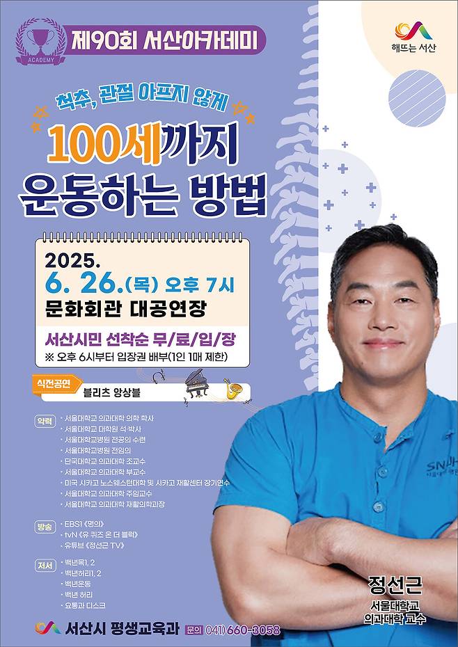 주요 저서로 '백년목', '백년허리' 등을 썼으며, EBS1 '명의', tvN '유퀴즈 온 더 블록', 유튜브 '정선근TV' 등 다양한 활동으로 대중들에게 건강 정보를 전하고 있다. 한편, 서산아카데미는 관심 있는 누구나 무료로 참석할 수 있으며, 시는 26일 오후 6시부터 서산시 문화회관 1층에서 입장권을 1인당 1매를 배부할 예정이다.