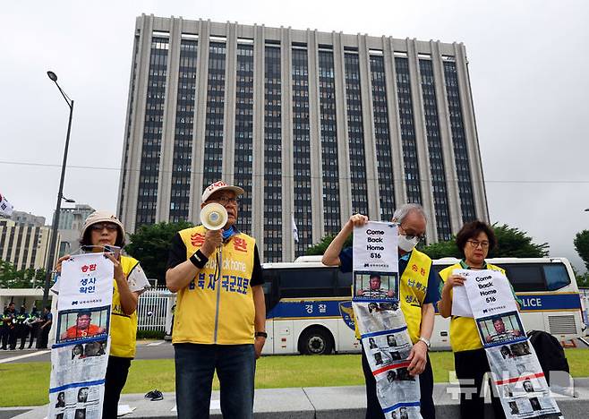[서울=뉴시스] 박주성 기자 = 최성룡 납북자피해가족연합회 대표와 남북피해자 가족들이 16일 서울 정부서울청사 정문 앞에서 전단 살포 이유와 살포된 전단지 내용, 실제 전단지를 보여주고 있다. 2025.06.16. park7691@newsis.com