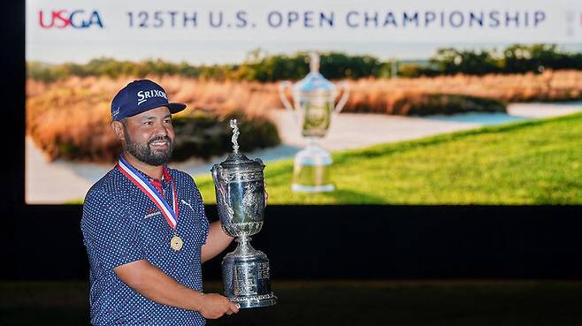 ▲ US 오픈 골프 토너먼트에서 우승한 후 트로피를 들고 축하하고 있는 J.J. 스펀