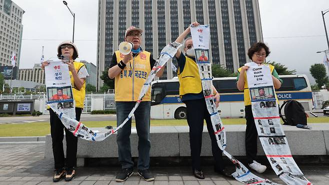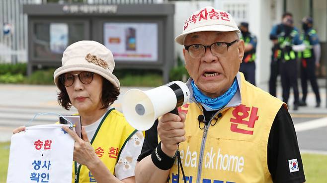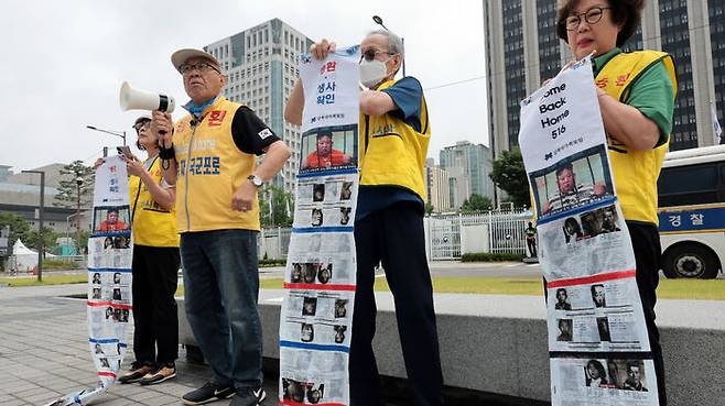 납북자가족모임의 최성용 대표는 오늘(16일) 오전 정부서울청사 정문에서 가진 기자회견에서, 이 대통령이 고교생 때 납북된 사람들의 어머니를 불러 위로한다면 전단지를 중단하겠다고 밝혔습니다.