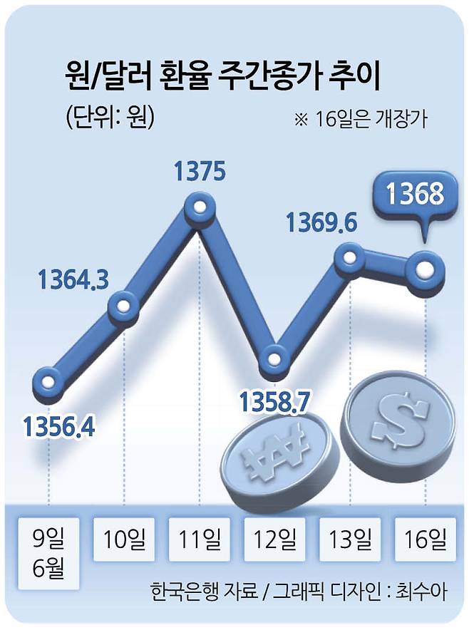 16일 서울 외환시장에서 달러화 대비 원화 환율은 전거래일 주간거래 종가보다 1.6원 내린 1368.0원에 거래를 시작했다. 중동 갈등 격화에도 시장의 내성 등으로 영향이 제한적이었다는 분석이 나온다.