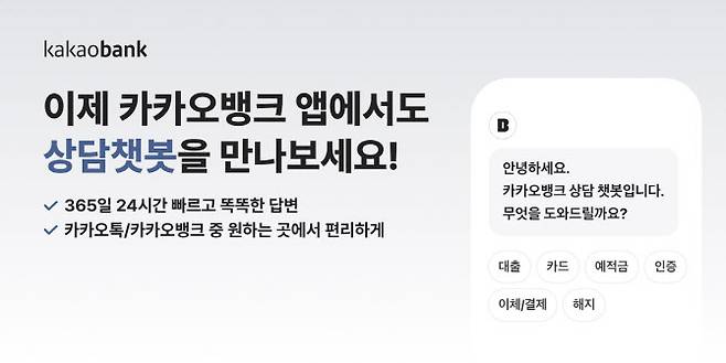 카카오뱅크 관계자는 “앱 내에서 챗봇 상담 서비스를 바로 이용하려는 고객의 니즈가 많아짐에 따라 상담 채널을 확대했다”며 “앞으로도 혁신 기술을 바탕으로 더 편리한 비대면 금융 상담 서비스를 제공하기 위해 노력하겠다”고 말했다.