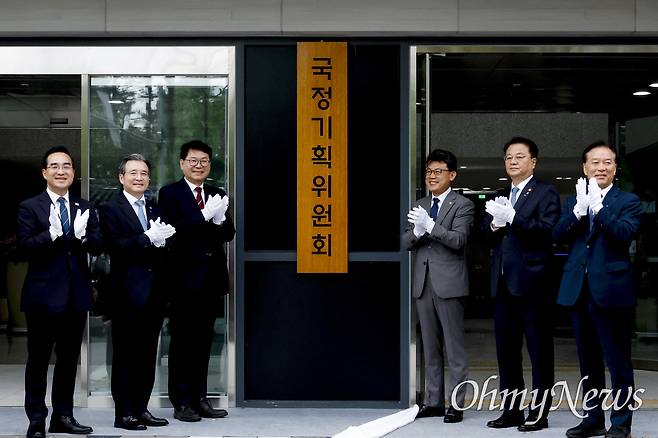 | ▲ 이재명 정부 대통령직인수위원회 역할을 할 국정기획위원회 출범식이 열린 16일 오전 서울 종로구 정부서울청사 창성동 별관에서 이한주 위원장과 김용범 대통령실 정책실장, 진성준 더불어민주당 정책위의장 등 참석자들이 현판식을 하고 있다. |
