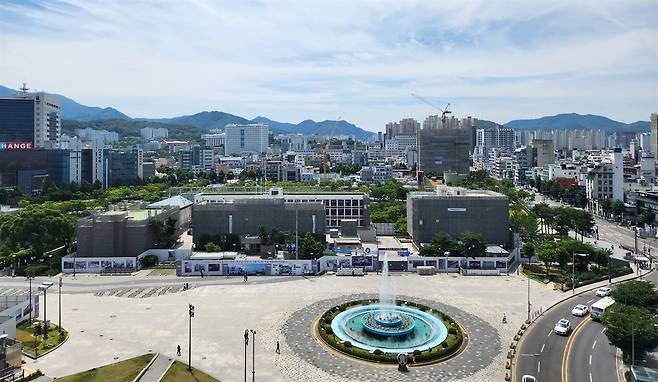 | ▲ 5.18민주화운동의 중심 공간이던 옛 전남도청과 분수대 일대. 현재 복원공사가 추진되고 있다. 전일빌딩245 옥상, 전일마루에서 내려다 본 모습이다. |