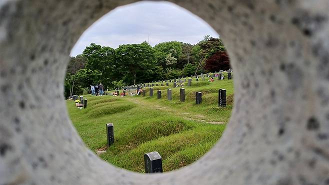 | ▲ 5.18 당시 희생자와 5.18이후 오월투쟁 과정에서 산화한 열사들이 묻힌 5.18망월묘역. 지금은 5.18 옛 묘지 또는 민족민주열사묘역으로 불린다. |