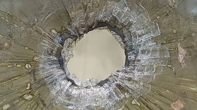 | ▲ 1980년 5월 계엄군의 총격을 받은 유리창 모습. 광주 5.18민주화운동 기록관 1층에 전시돼 있다. |