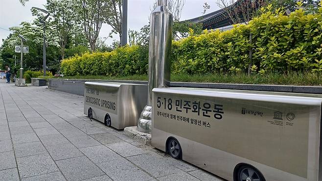 | ▲ 80년 5월 20일 버스와 택시 운전자들의 차량시위를 떠올리게 하는 버스와 버스승강장 조형물. 5.18민주광장과 전일빌딩245 사이 도로변에 만들어져 있다. |