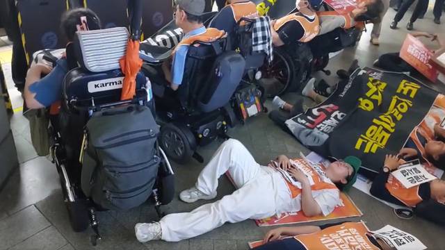 이들은 승강장에 누워 “이제는 진짜 장애등급제 폐지하라”, “탈시설권리 이행하라” 등 구호를 외쳤습니다.