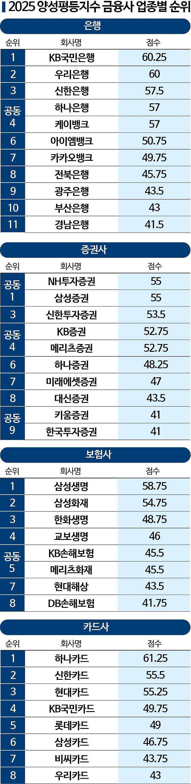 금융기업 37곳을 대상으로 한 '2025 아시아양성평등지수'에서 하나카드가 종합 1위를 차지했다. 고용·보상·육성·양립·기타 등 5개 평가 부문에서 고른 점수를 받아 총점 61.25점을 기록했다. 반면 한국투자증권과 키움증권은 각각 41점으로 공동 최하위에 머물렀다.