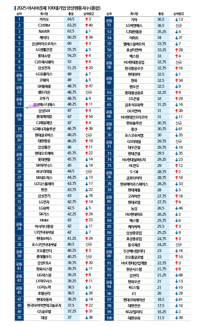 국내 상장사 100대 기업을 대상으로 한 '2025 아시아 양성평등지수'에서 카카오가 1위를 차지했다. 카카오는 총점 64.5점으로 지난해보다 3계단 상승했다. 고용·보상·육성·양립·기타 등 5개 평가 부문 모두 고르게 높은 점수를 얻었다. 반면 석유화학업체 대한유화는 총점 11.5점으로 최하위를 기록했다.