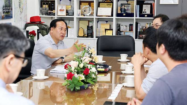 ▲ 이권재(왼쪽에서 두번째) 오산시장과 물류센터 반대 오산·동탄비상대책위 간담회