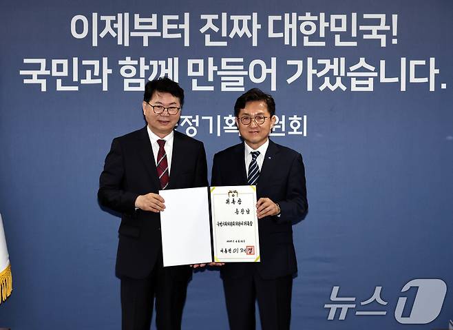 (서울=뉴스1) 신웅수 기자 = 이한주 국정기획위원회 위원장(왼쪽)이 16일 서울 종로구 정부서울청사 창성동 별관에서 열린 출범식에서 사회2분과장을 맡은 홍창남 부산대 부총장에게 위촉장을 수여한 뒤 기념촬영을 하고 있다. (공동취재) 2025.6.16/뉴스1