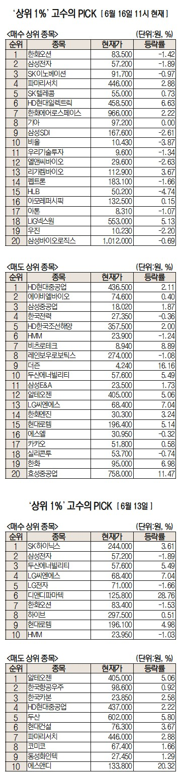 미래에셋증권은 자사 고객 중에서 지난 1개월간 수익률 상위 1% 투자자들의 매매 종목을 집계해 실시간·전일·최근 5일 기준으로 모바일트레이딩시스템(MTS) 상에서 공개하고 있다. 이 통계 데이터는 미래에셋증권의 의견과 무관한 단순 정보 안내이며 각각의 투자자 개인에게 맞는 투자 또는 수익 달성을 보장하지 않는다. 또 테마주 관련 종목은 이상 급등락 가능성이 있으므로 유의해야 한다.