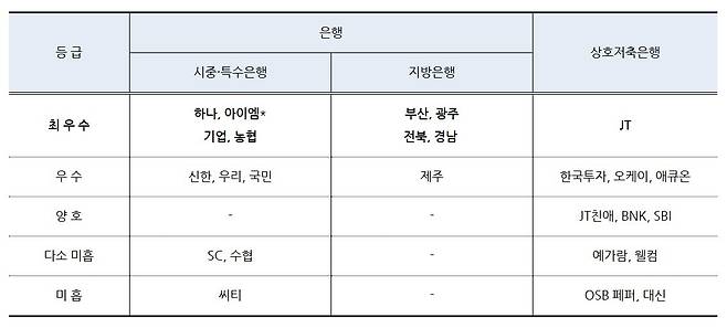 | ▲ 2024년 금융회사 지역재투자 평가 결과 금융위원회가 예금 수취 은행을 대상으로 매년 평가해서 발표함 |