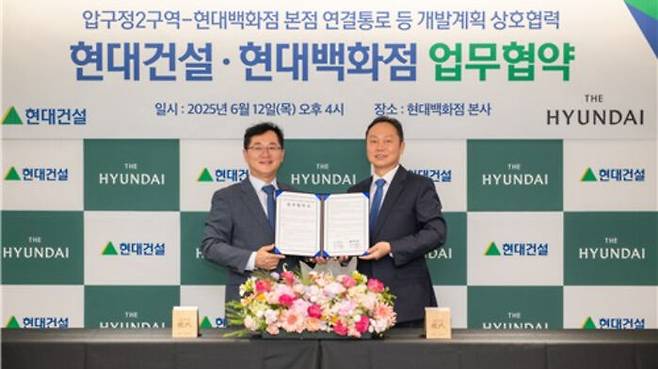 현대건설은 지난 12일 현대백화점과 '압구정 2구역과 현대백화점 본점 연결통로 등 개발에 관한 업무협약'을 체결했다고 오늘(16일) 밝혔습니다.