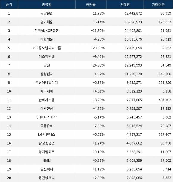 한편 거래량 상위 20위권 종목들은 삼성전자(005930) ▼1.97%, 두산에너빌리티(034020) ▲6.78%, 메타케어(118000) ▲4.61%, ..., 웅진씽크빅(095720) ▲2.89% 등의 성적을 기록했다.