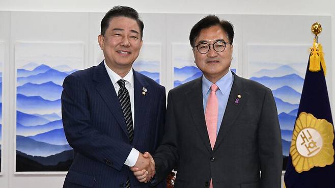 ▲ 우원식 국회의장(오른쪽)이 16일 국회 의장실을 예방한 더불어민주당 김병기 당 대표 직무대행 겸 원내대표와 인사하고 있다.