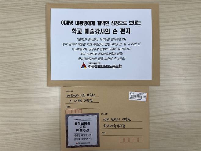 | ▲ 전국학교비정규직노동조합은 지난 13일 용산 대통령실 앞에서 '학교예술교육 민생추경 편성 촉구 기자회견'을 개최했다. 기자회견 후 이들은 관련 내용이 담긴 학교 예술강사의 손 편지와 우표가 부착된 이재명 대통령의 답신용 봉투를 대통령실에 전달했다. |