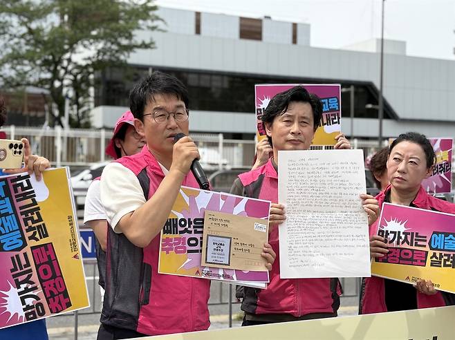 | ▲ 전국학교비정규직노동조합은 지난 13일 용산 대통령실 앞에서 '학교예술교육 민생추경 편성 촉구 기자회견'을 개최했다. 이재명 대통령에게 보내는 손 편지를 쓴 성석주 전국예술강사분과장과 함께 민태호 위원장이 발언하고 있다. |