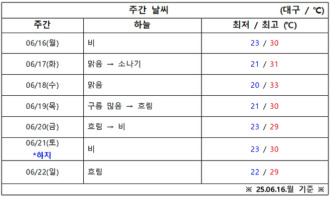 6월 3주 차 아침 기온 20도에서 23도, 낮 기온 29도에서 33도 예상됩니다.