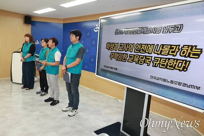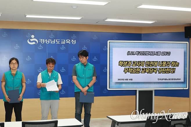 또 경남교육청이 추진하는 '학교안전 관련 조례 개정'에 대해, 전교조 경남지부는 "교육감의 책무를 강화하기보다는 오히려 학교장과 교사에게 안전 책무를 부담시키는 방향으로 추진되고 있다"라며 "교육감은 교육청 차원의 안전 시스템 구축과 현장 지원에 책임을 져야 함에도 불구하고, 책임을 현장에만 떠넘기려 하고 있다"라고 했다.