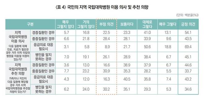중증질환일 경우 더 심각하다. 지역 국립대병원을 이용하겠다는 응답자는 43.5%에 불과했고, 가족이나 지인에게 추천할 의향이 있다는 비율은 33.7%에 그쳤다. 아예 "그렇게 안 하겠다"는 부정 의견도 각각 28.4%, 30.9%나 된다. 국립대병원이 지역 내 의료 시스템의 최후 보루로서 국민 신뢰를 충분히 확보하지 못하고 있다는 뜻이다.