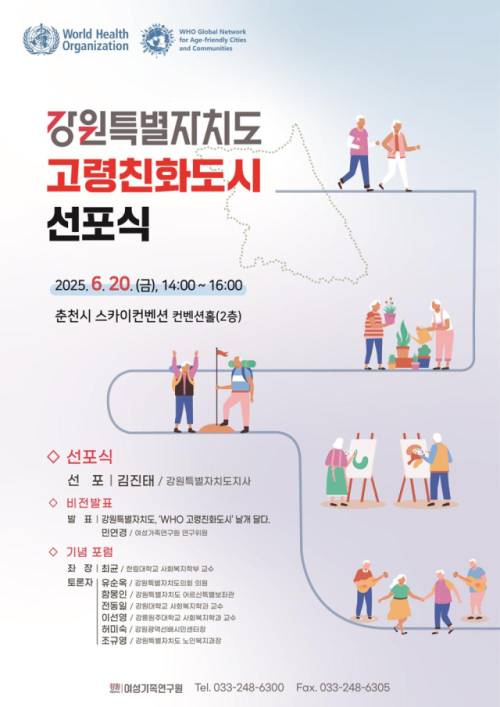 강원특별자치도여성가족연구원이 세계보건기구(WHO) 고령친화도시 가입을 기념해 오는 20일 오후 2시 춘천 스카이컨벤션에서 '고령친화도시 선포식'을 개최한다.