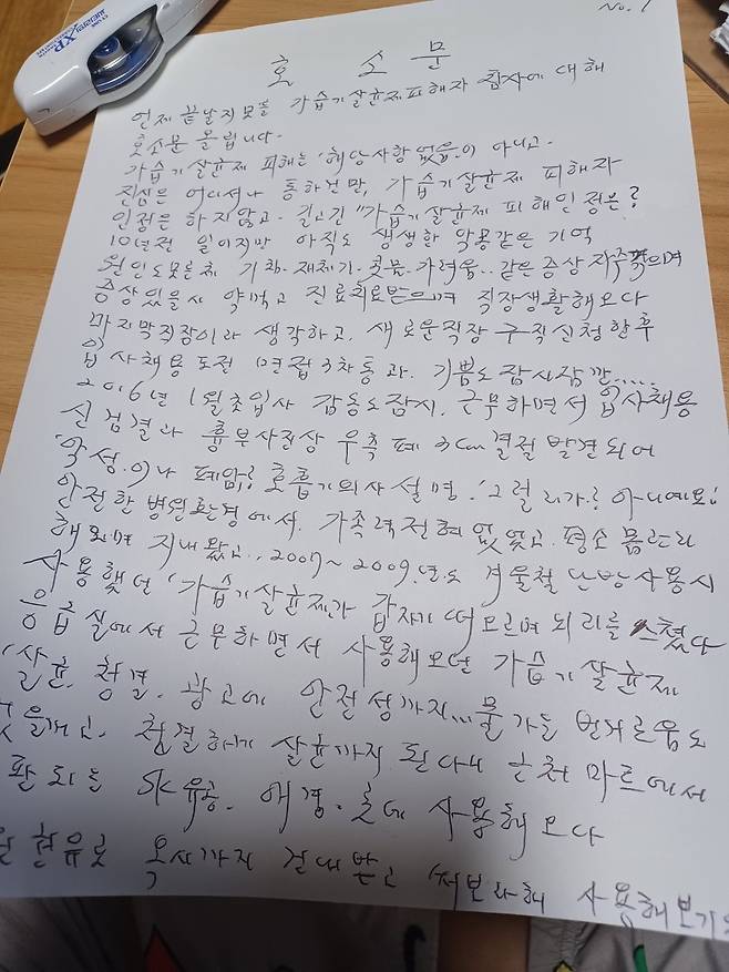 | ▲ 가습기살균제피해자 조인재씨가 직접 작성한 대통령께 드리는 호소문 |