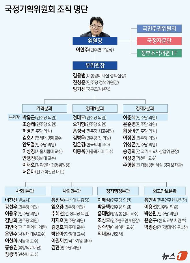 (서울=뉴스1) 양혜림 디자이너 = 이재명 정부의 임기 5년 국정 밑그림을 그릴 국정기획위원회가 16일 닻을 올린 가운데, 참여 인사들의 면면에도 관심이 쏠린다. 국정기획위의 수장은 이한주 민주연구원장이 맡는다. 이 위원장은 경제학자이자 정책 전문가로, 이재명 대통령과 성남시장 시절부터 함께하며 기본소득, 지역화폐 등 정책을 설계한 핵심 멘토다. 문재인 정부에서 국정기획자문위원회 경제1분과를 맡기도 했다. 부위원장에는 김용범 대통령실 정책실장과 진성준 더불어민주당 정책위원장, 방기선 국무조정실장이 임명됐다.