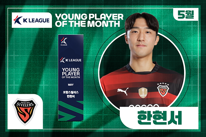 포항 스틸러스 수비수 한현서가 한국프로축구연맹 선정 5월 이달의 영플레이어상을 수상했다.