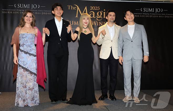 (서울=뉴스1) 김진환 기자 = 프랑스 문화예술공로훈장 최고 등급 '코망되르'를 수훈한 세계적인 소프라노 조수미가 16일 오후 서울 중구 더플라자호텔 메이플홀에서 열린 '더 매직, 2025 조수미와 위너들'(The Magic, 2025 Sumi Jo and Winners) 개최 기념 기자간담회에서 제1회 조수미 국제 성악 콩쿠르 수상자들과 포즈를 취하고 있다.