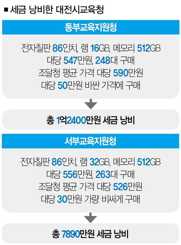 대전동부교육지원청은 조달청에서 평균 490만원인 전자칠판을 대당 50만원이나 비싼 547만원에 구입했다. 서부교육지원청은 520만원 수준인 전자칠판을 556만원에 구입하면서 대당 30만원가량의 세금을 더 썼다.