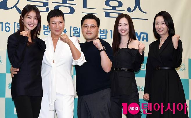 이시영, 정영주, 김다솜, 남기애, 민진기 감독이 16일 서울 마포구 상암 스탠포드호텔에서 열린 ENA 새 월화드라마 <살롱 드 홈즈> 제작발표회에 참석해 포즈를 취하고 있다. 살롱>