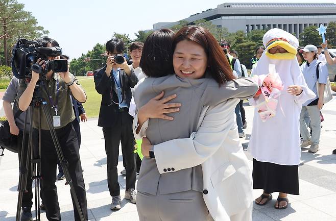 | ▲ 비례대표 의원직을 승계한 손솔 진보당 의원이 12일 오전 서울 여의도 국회에서 열린 등원식에 참석하자, 김재연 진보당 대표가 안아주며 축하해 주고 있다. |