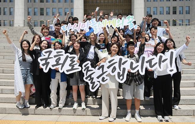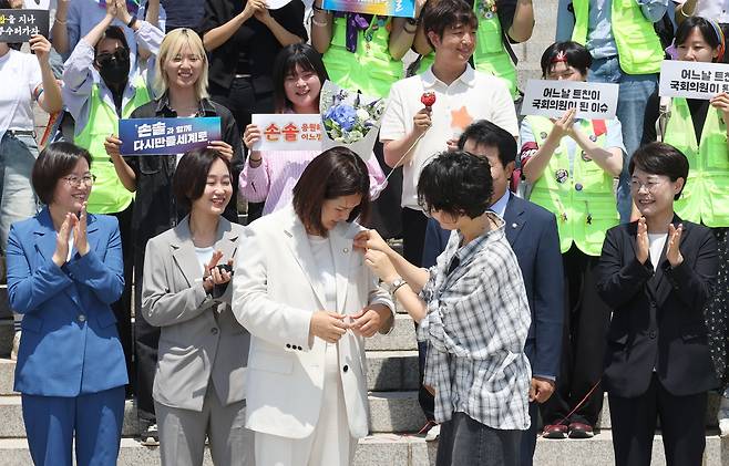 만 30세인 손 의원은 대선 후 대통령실 참모로 간 강유정·위성락 전 의원의 비례대표 의원직을 승계받아 22대 국회 최연소 의원이 됐다. 그는 지난 12일 국회 등원식을 '광장의 청년들'과 함께 했다. 계엄 후 대학가 시국선언을 시작한 대학생이 직접 의원 배지를 달아줬고, 함께 자원봉사단을 꾸렸던 이들은 '인간 화환'을 만들어 손 의원을 응원했다.