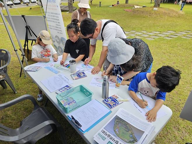 | ▲ 자연과 생태를 주제로 한 시민 참여 활동이 활발하게 진행되는 모습이다. 아이들과 가족들이 한자리에 모여 환경 보호를 주제로 활동에 참여하고 있다. 이어 테이블 위에는 색연필, 안내 책자, 서명지, 그리고 소들섬 관련 자료가 준비되어 있으며 참가한 초등학생은 소들섬 그림을 색칠하고 있다. |