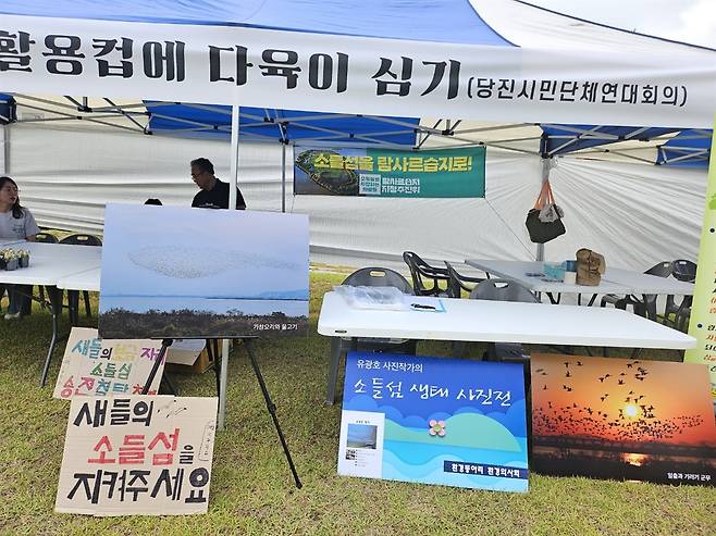 | ▲ 부스 앞에는 철새 군무와 낙조 속 철새 떼 사진이 전시되어 있다. 새들의 낙원, 소들섬을 지켜주세요'라는 손 팻말을 통해 철새 서식지 보전을 촉구하는 메시지를 전달하고 있으며, 생태 사진전과 시민 참여 활동을 통해 지역 생태 보호의 중요성을 알리고 있다. |
