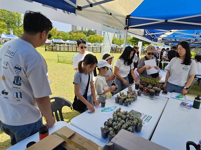 | ▲ 테이블 위에는 다양한 종류의 다육 식물이 준비되어 있으며, 아이들과 보호자들이 함께 식물을 고르고 설명을 듣고 있다. 재사용 컵을 활용한 친환경 체험을 통해 자원 순환과 생태 감수성을 높이는 활동이 진행 중이다. |