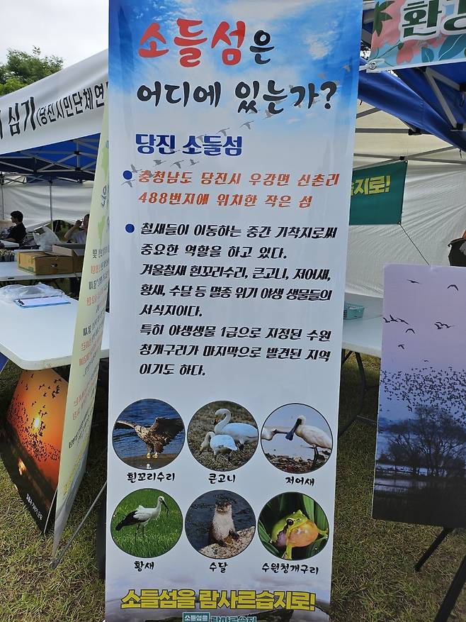 | ▲ 현수막은 충남 당진시 우강면 신촌리 488번지에 위치한 소들섬의 생태적 가치를 설명하고 있으며, 이 지역이 철새들의 중간 기착지로서 큰 역할을 하고 있음을 강조하고 있다. 무엇보다 흰꼬리수리, 큰고니, 저어새, 황새, 수달, 수원청개구리 등 주요 보호종의 사진이 함께 소개되어 있으며, ‘소들섬을 람사르습지로!’라는 문구로 보호의 필요성을 강조하고 있다. |