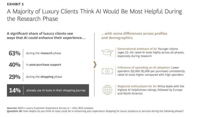 조사 결과, 63%의 고객이 리서치 단계에서 AI가 도움이 될 것이라고 답했으며, 40%는 구매 후 지원에서, 29%는 쇼핑 단계에서 AI 활용을 원한다고 응답했다. 이미 14%의 고객은 쇼핑 여정에서 AI 도구를 사용하고 있다. 특정 인구통계학적 그룹에서는 열정이 더욱 높게 나타났는데, 럭셔리 고객의 새로운 세대인 젊은 고객들은 구매 여정의 모든 단계에서 AI 도구를 높게 평가했다.